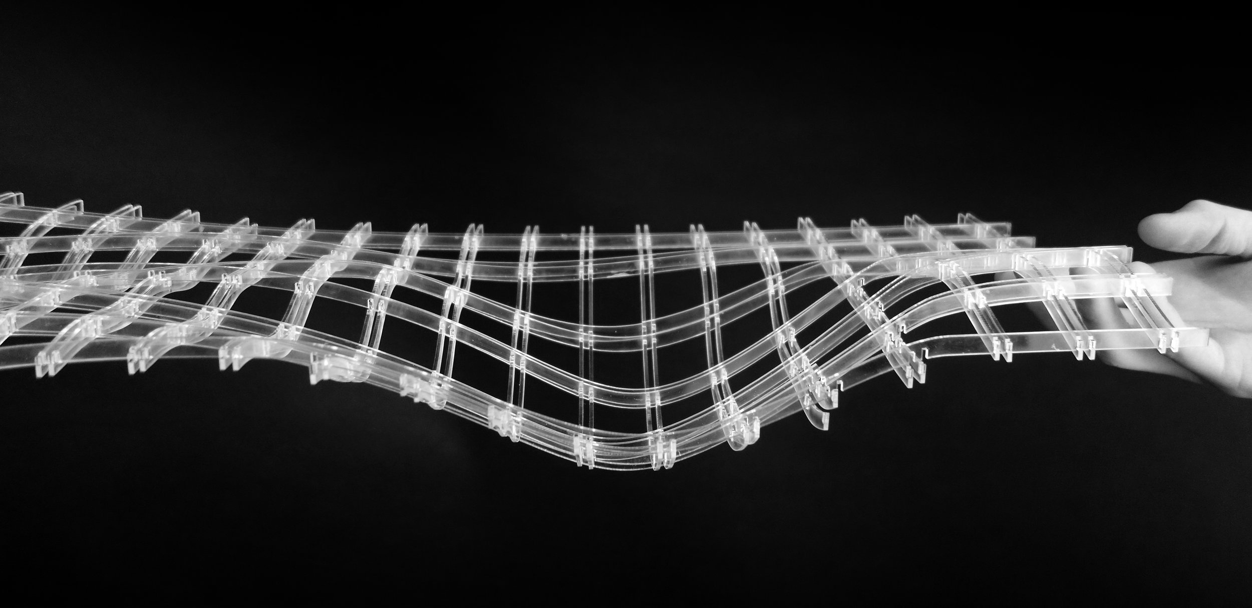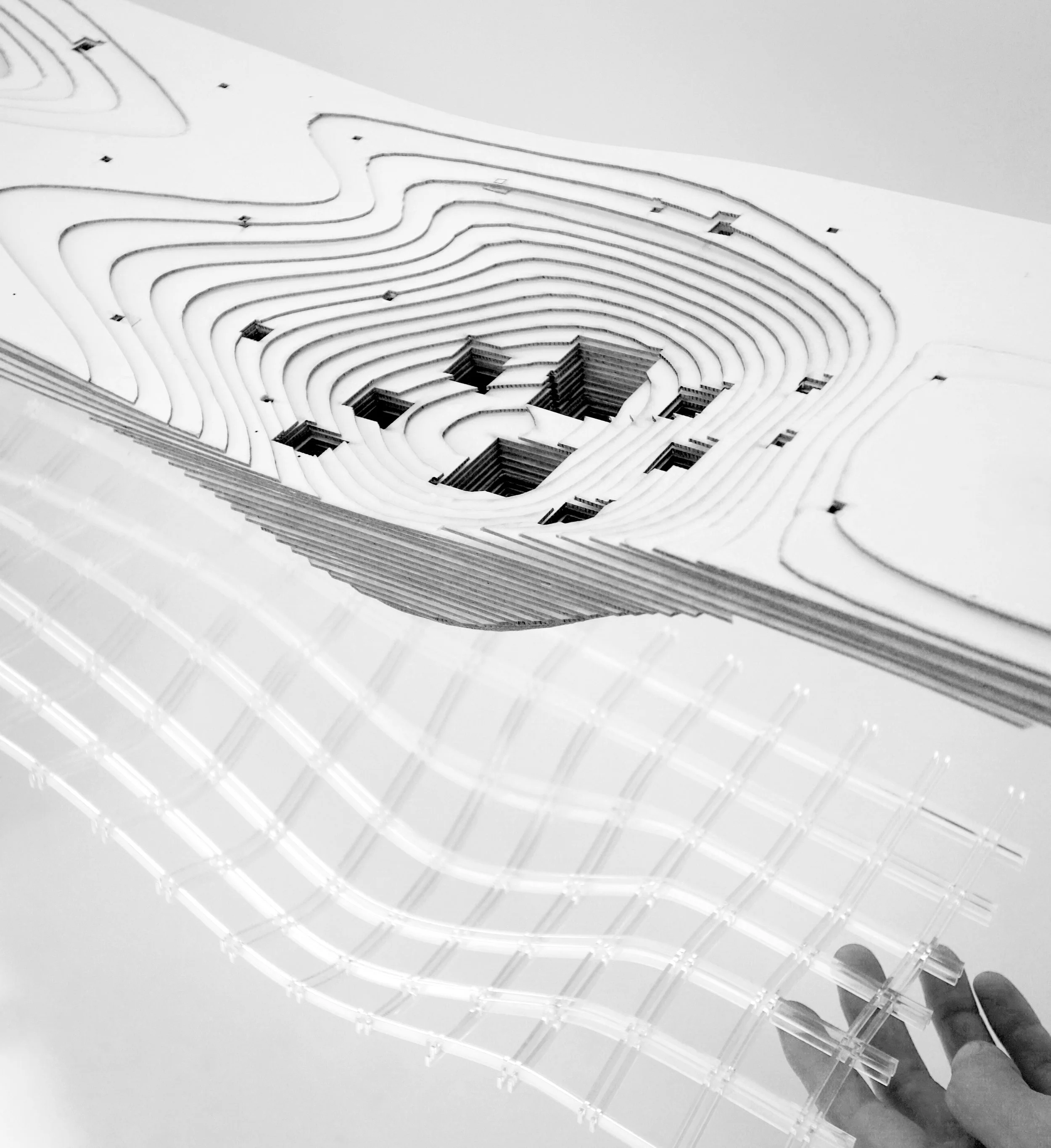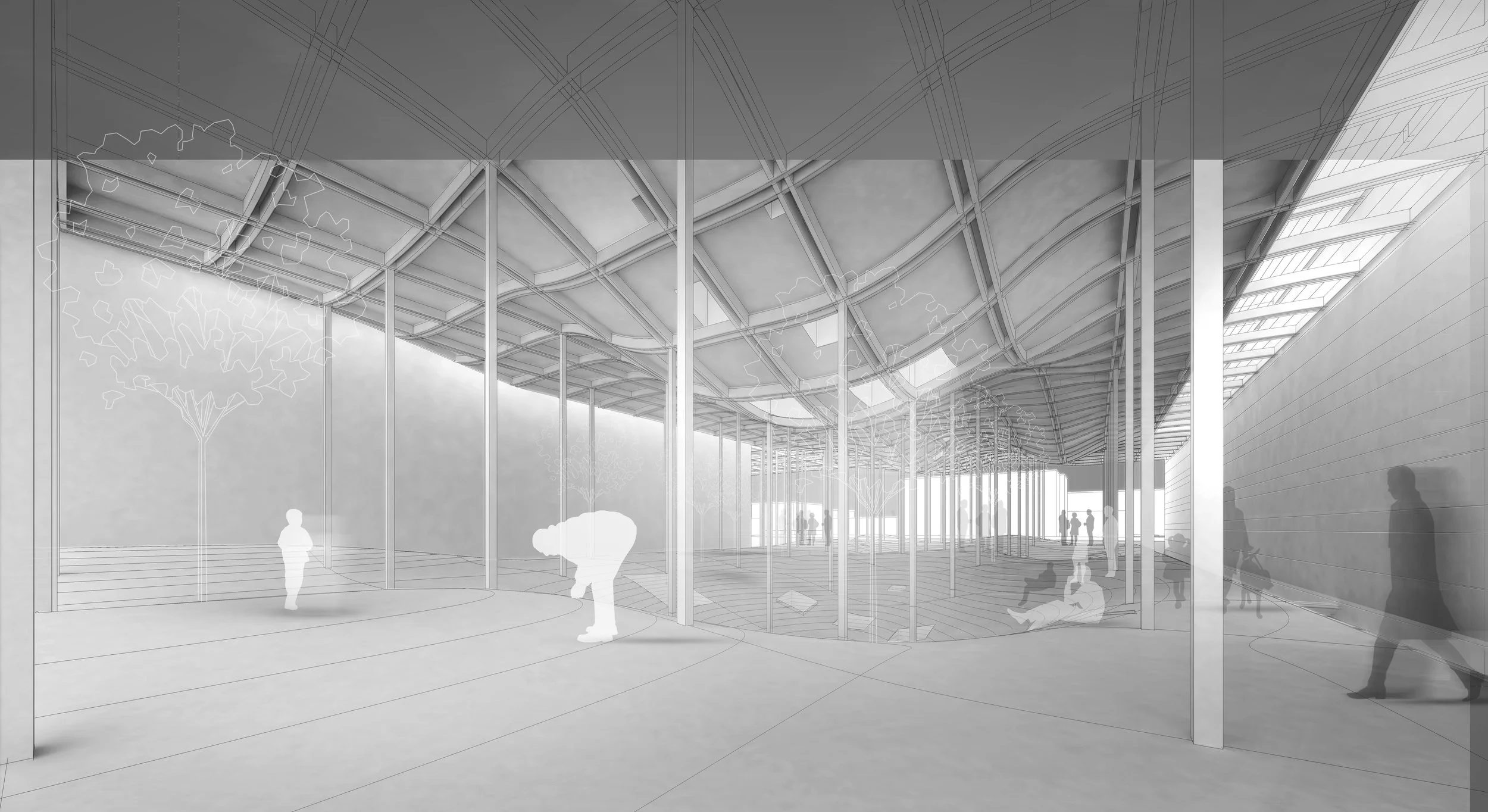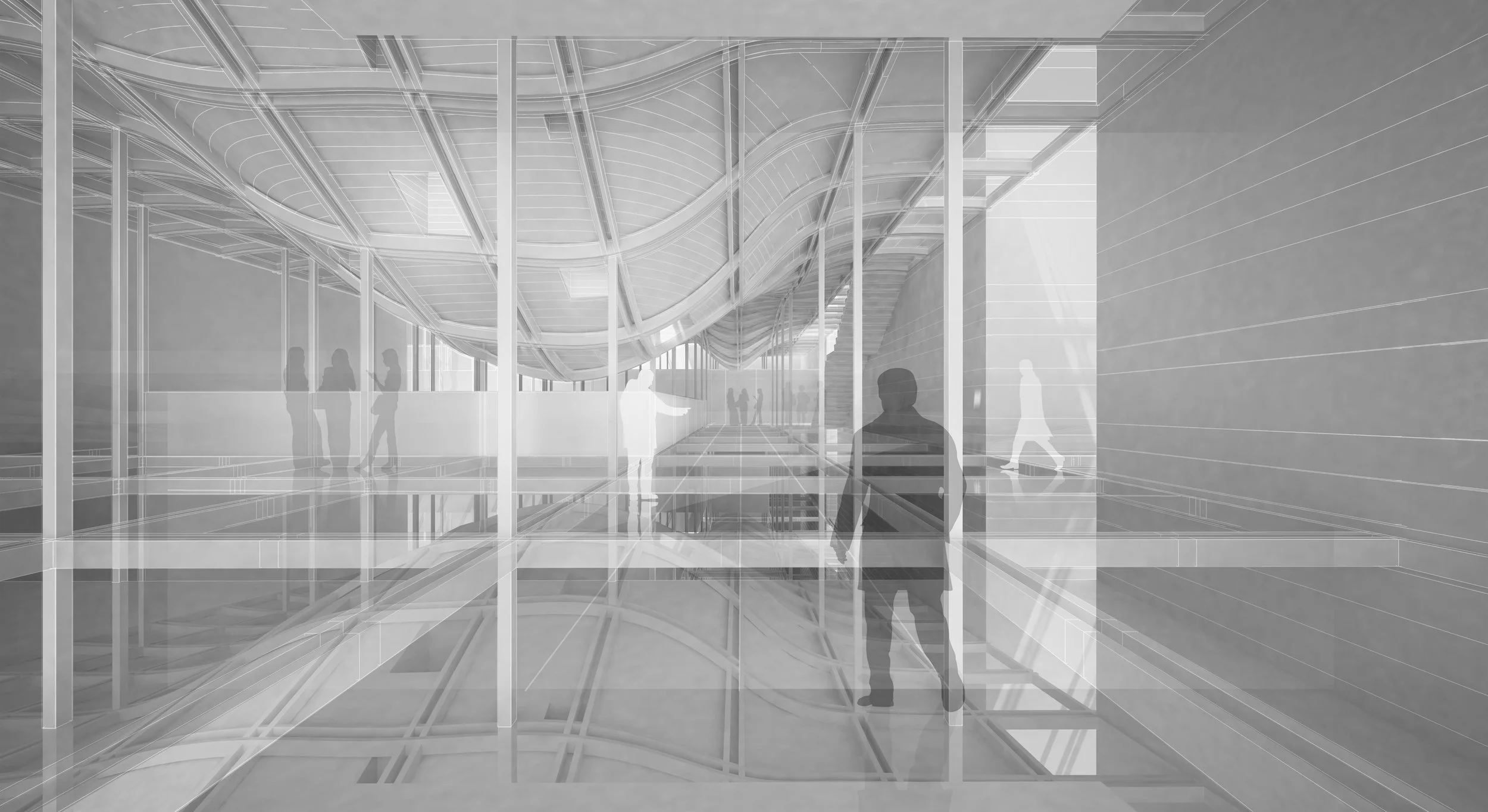 Semi-interiorperspective captures the space formed by the grid system. It is deformed to create the structure supporting artificial landscape in the upper level. The slab is constructed of 5'x5' steel beam structure and transparent panel