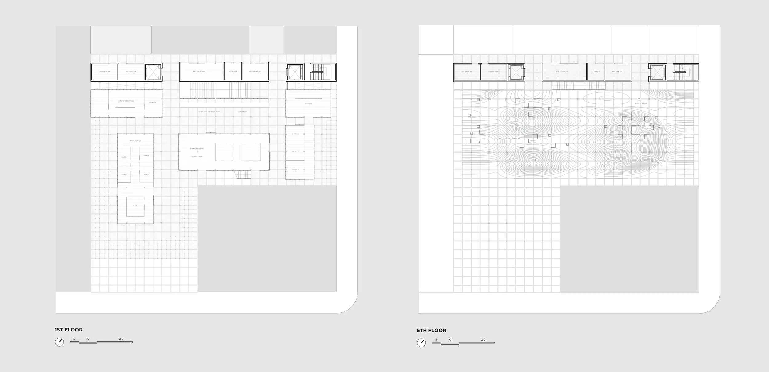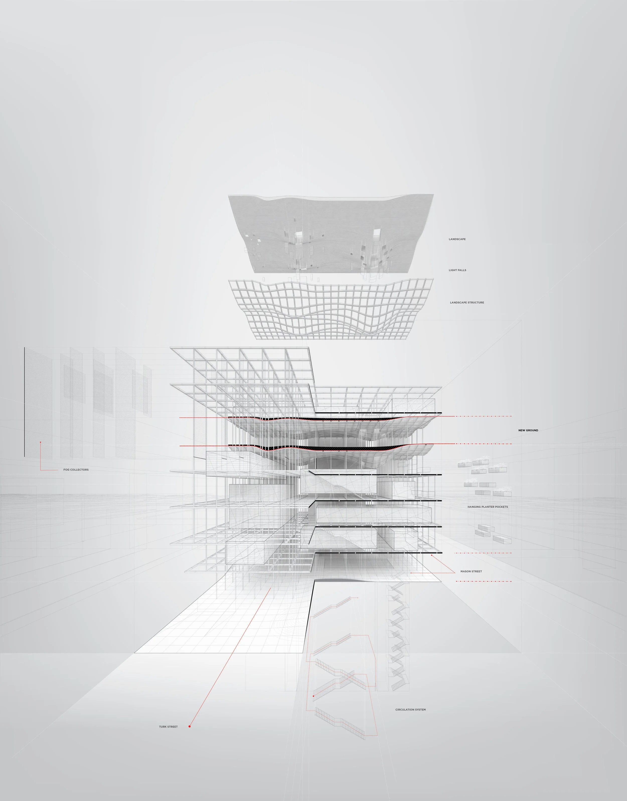 This project focuses on creating a new urban condition by developing a formal design system capable of responding to emerging complexities of a new urban context in San Francisco. By introducing the artificial landscape on the upper levels, the building spatially informs a new urban public space. This new landscape aims to redefine the spatial conditions of an urban environment while contributing to the urban forest of the city.