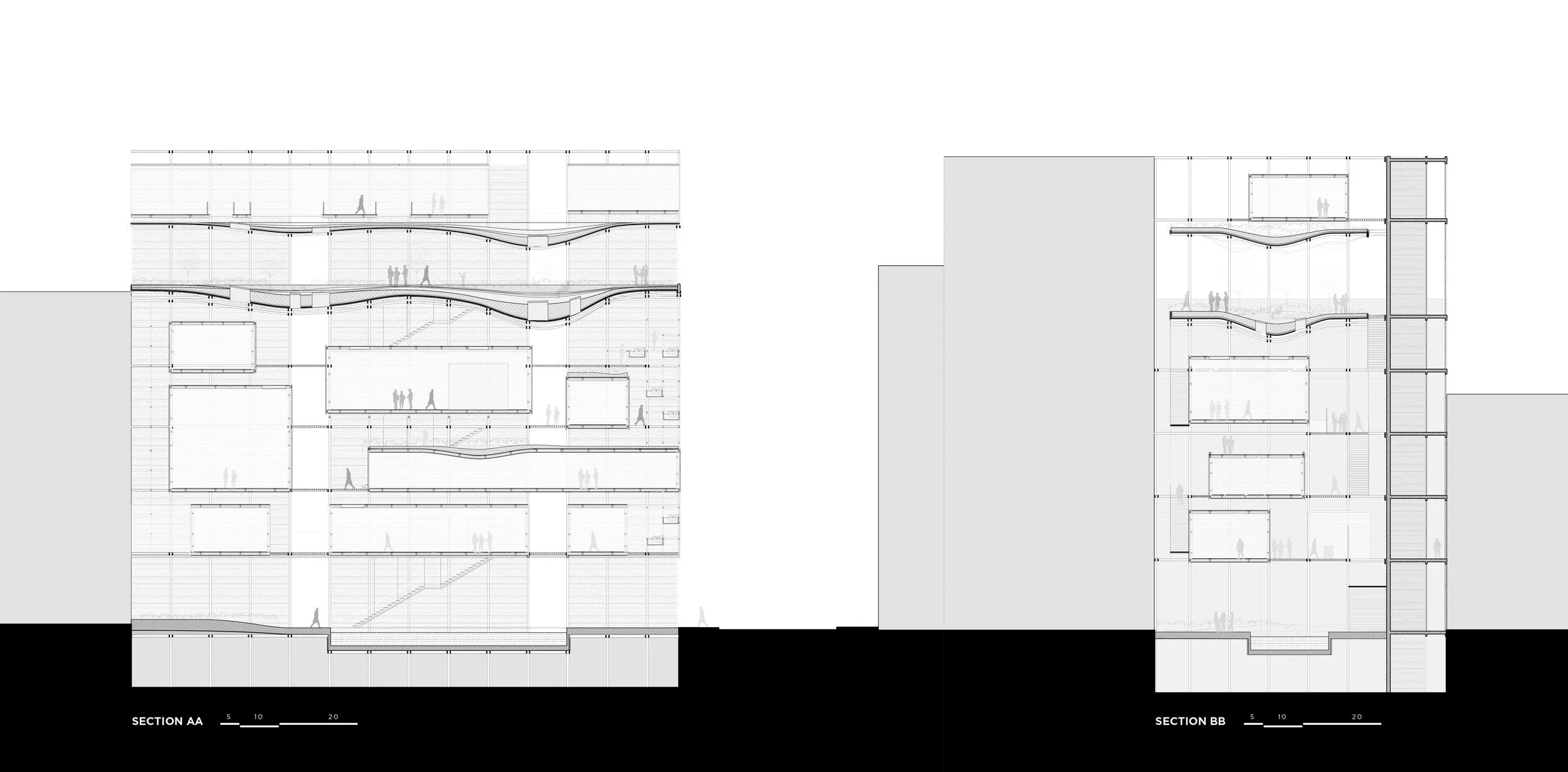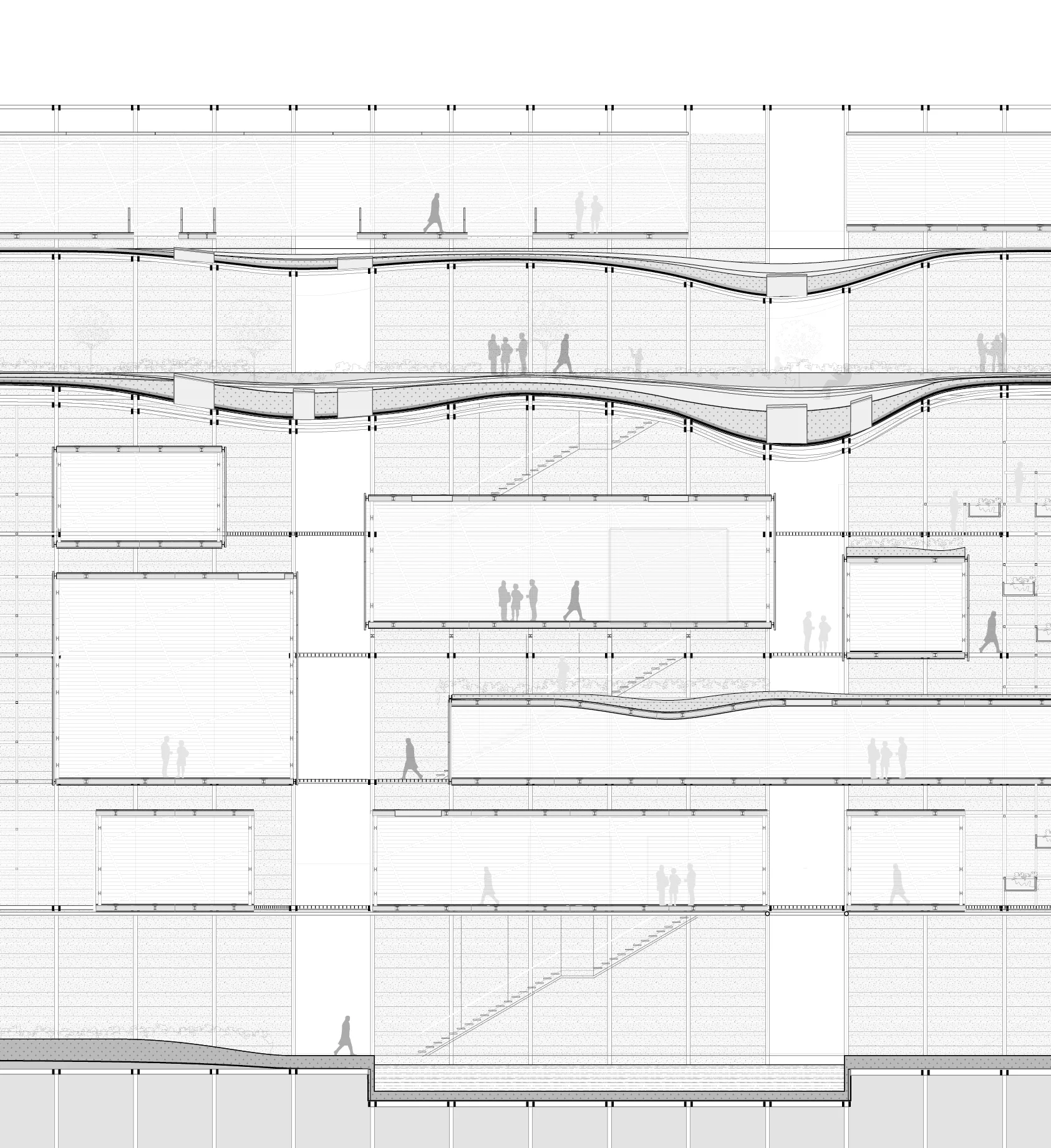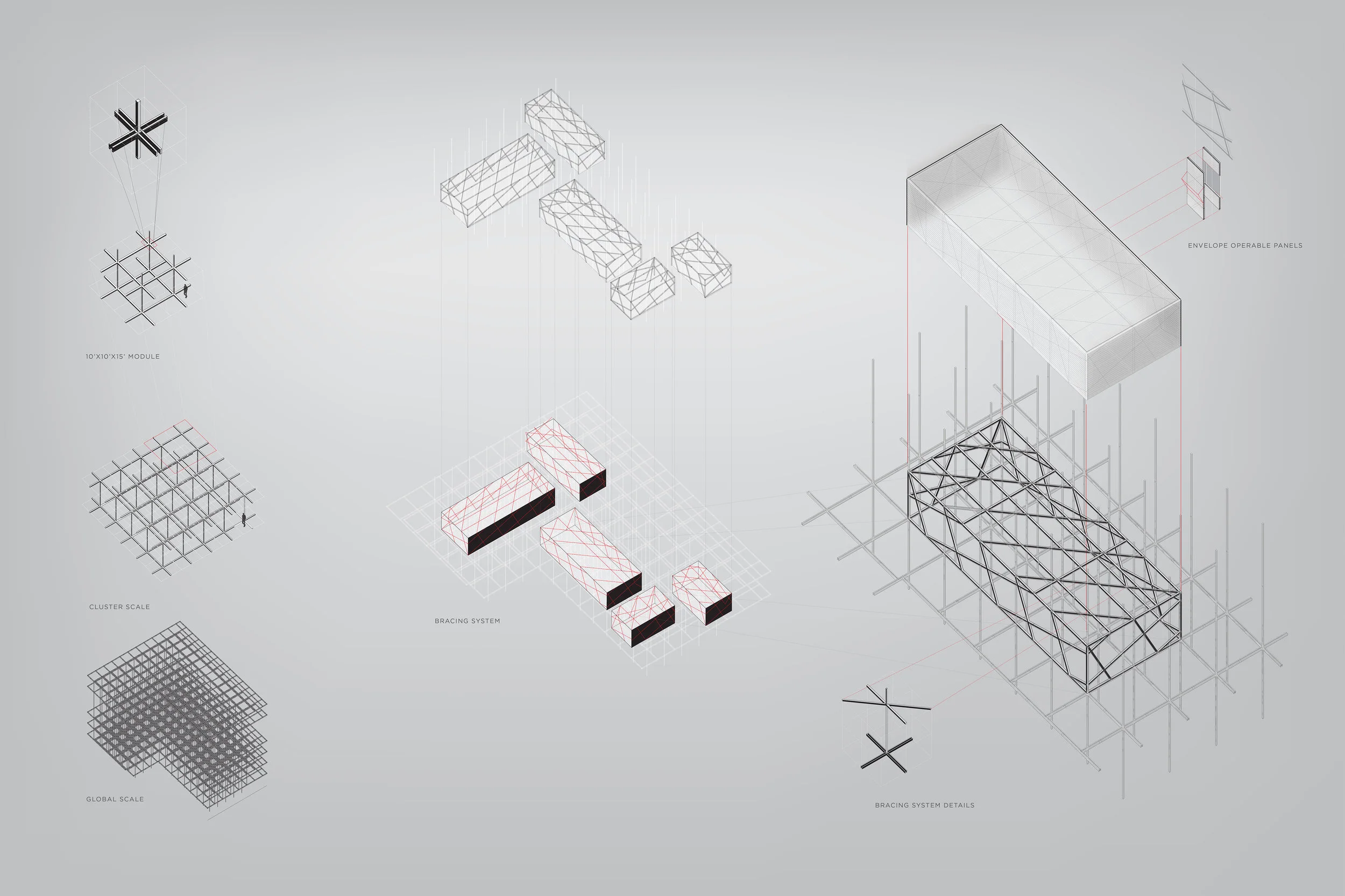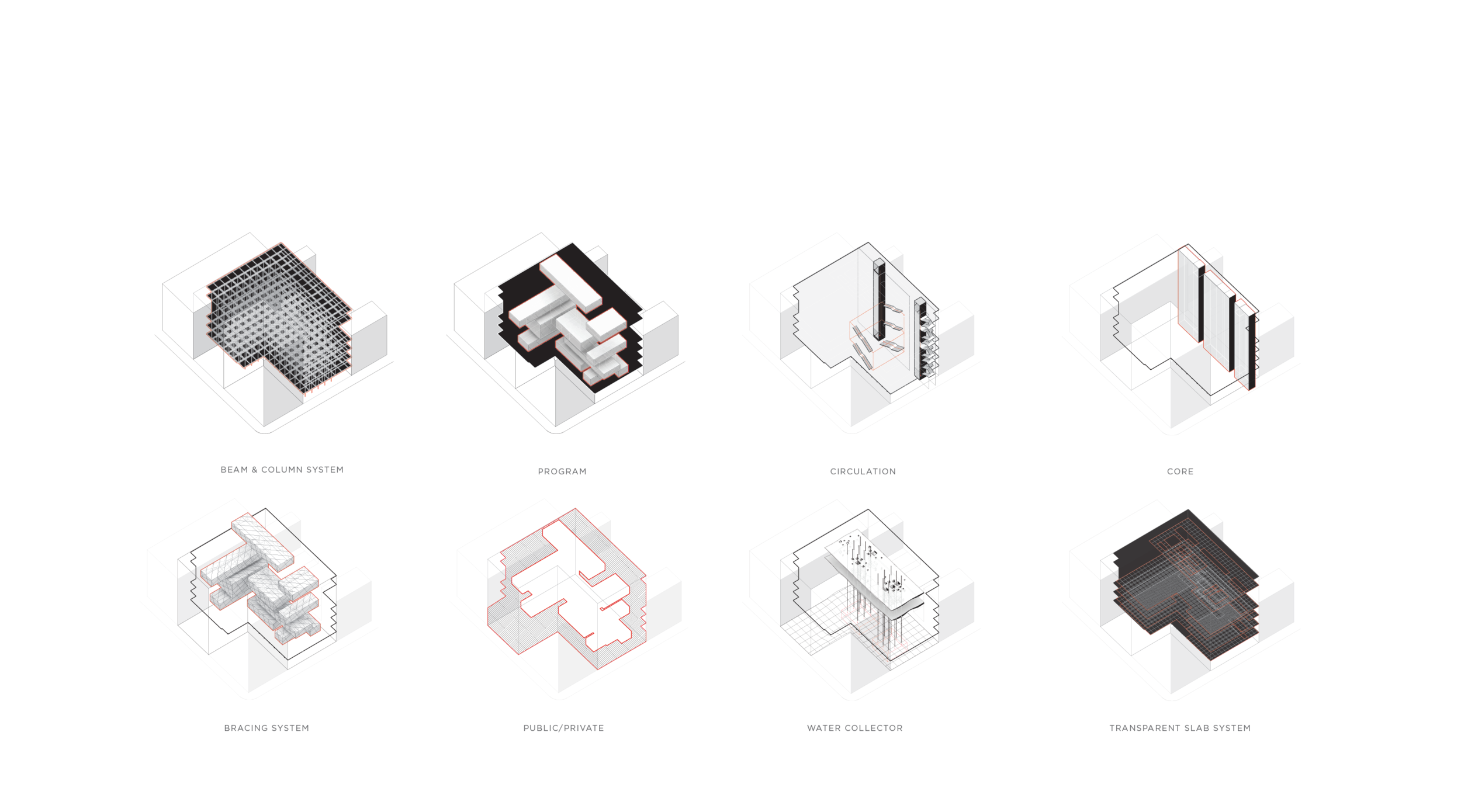 The grid system in the project is developed to challenge and redefine the conventional post-and-beam structure. The system acts not only as structure but also as the spatial field that organizes and connects all the programs together in a network. The spatial connection is created in both vertical and horizontal directions. The design maximizes the public zone, encouraging an abundance of events and social encounters.