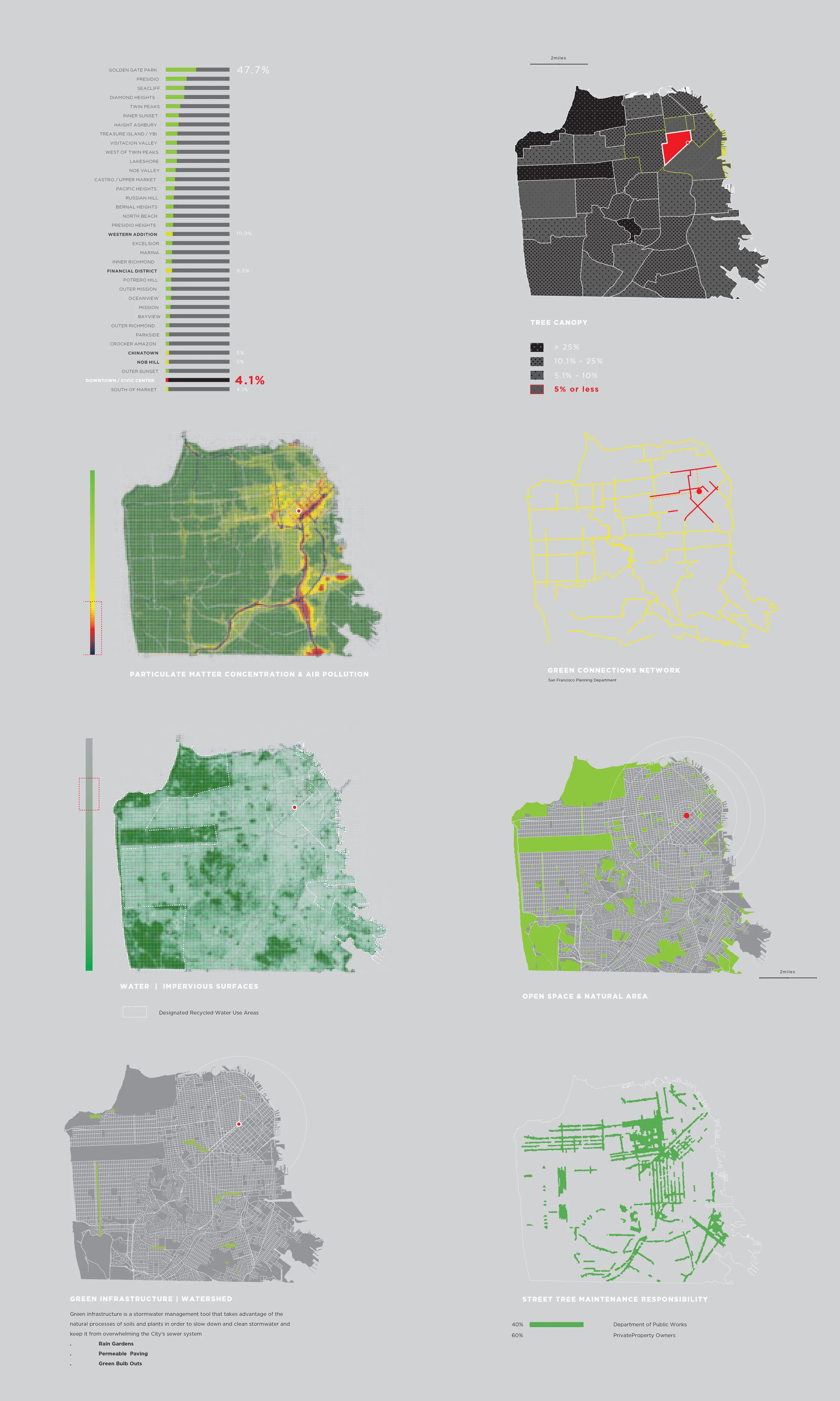 Map drawings analyzing the urban forest condition of San Francisco. (Data resource: http://www.sf-planning.org/)