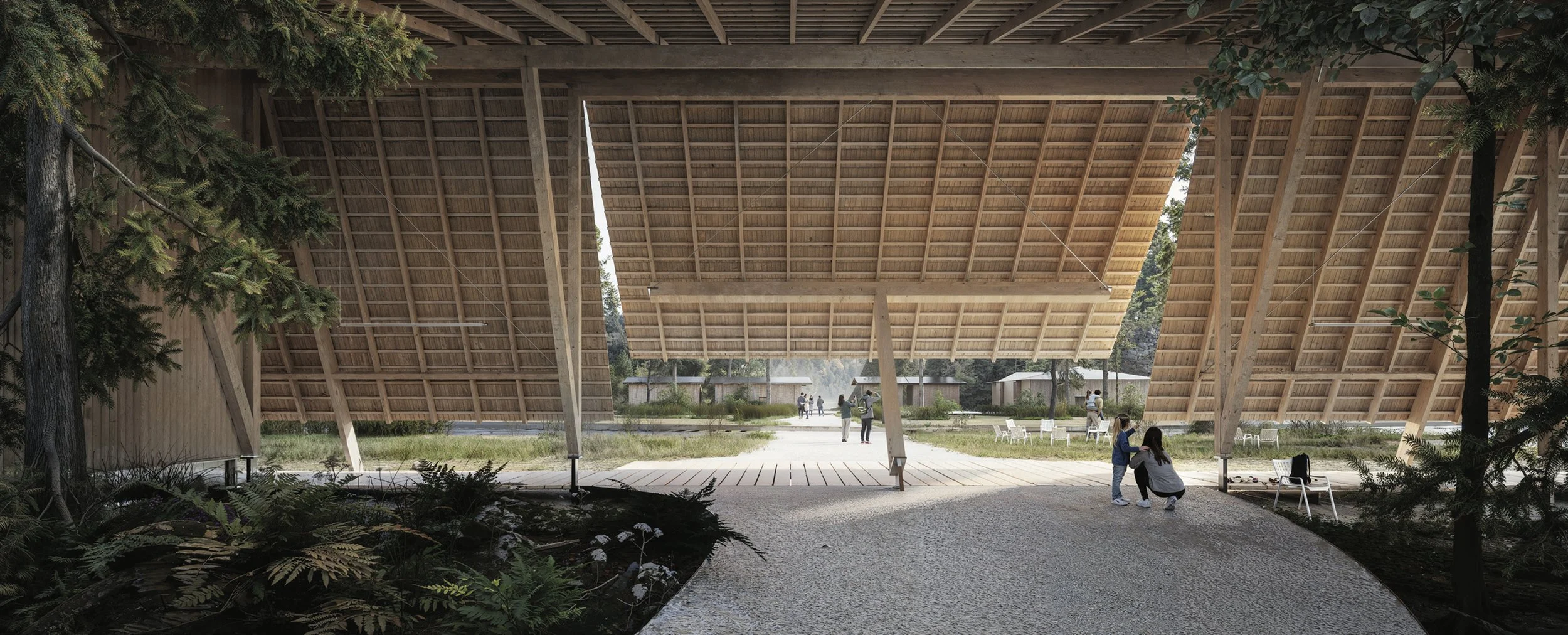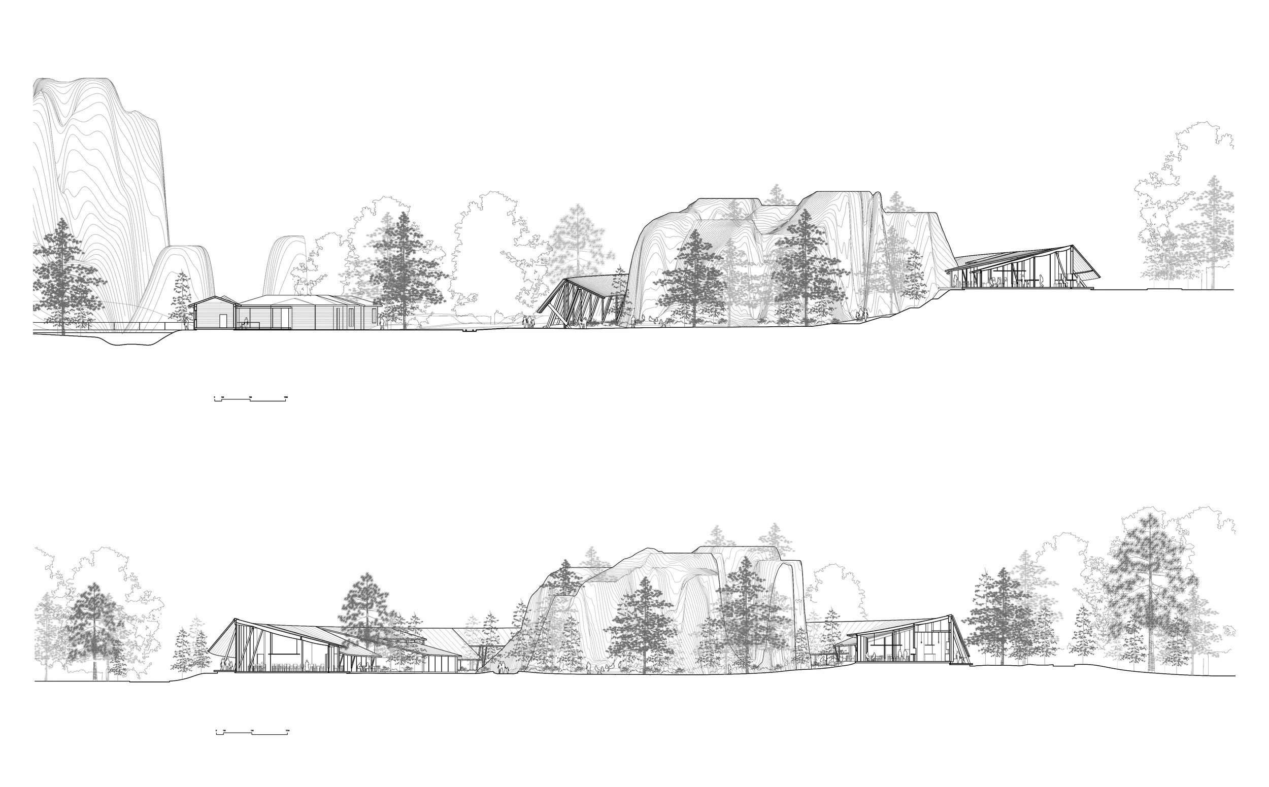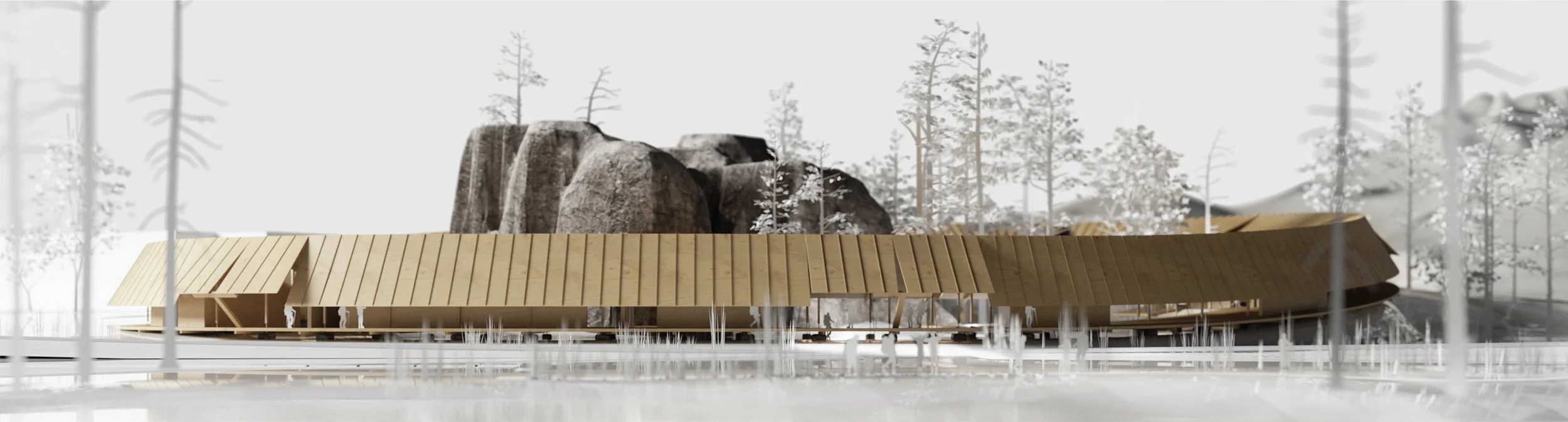 The project proposes a singular architectural gesture: a continuous, unified ring that encircles a forested courtyard—establishing a clear threshold to the Adršpach Rocks. This form organizes movement, frames nature, and enhances the visitor’s journey. Rather than scattering buildings across the site, the ring creates clarity, efficiency, and intimacy—offering an infrastructural framework that is both practical and poetic.
